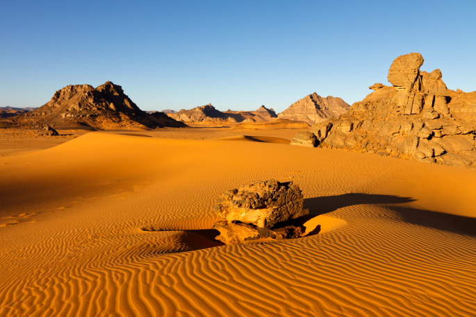A travers un paysage varié, escale dans les belles gueltas d’Issakrassene. Pique-nique au bord des gueltas d’Adjef Melene. Bivouac et campement à Hirafok.
